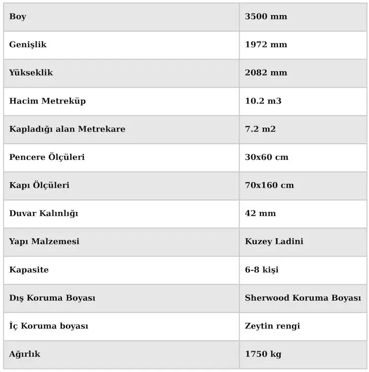 Bu model, 42 mm kalınlığındaki Kuzey Ladini duvarları sayesinde üstün bir ısı yalıtımı sağlar ve en soğuk havalarda bile içerisinin sıcak kalmasını garantiler. Dış kısmı Sherwood koruma boyası ile kaplanmış olup, zeytin renğindeki iç koruma boyası ile doğal ve zarif bir görünüm kazandırılmıştır. 1750 kg ağırlığı ile sağlam ve dayanıklı olan bu sauna, uzun ömürlü kullanım sunar.
