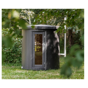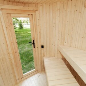 Bu saunanın terası, giyinme odası ve duş alanı bulunmaktadır. 70×160 cm boyutlarındaki kapısı saunanın içerisine kolay bir giriş çıkış olanağı yaratırken, 30×60 cm ölçülerindeki penceresi doğal ışığı içeriye alır. Dış koruması Sherwood koruma boyasıyla sağlanmıştır. İç korumasında ise uzun ömürlü , zeytin rengi kullanılarak estetik bir görünüm kazandırılmıştır.